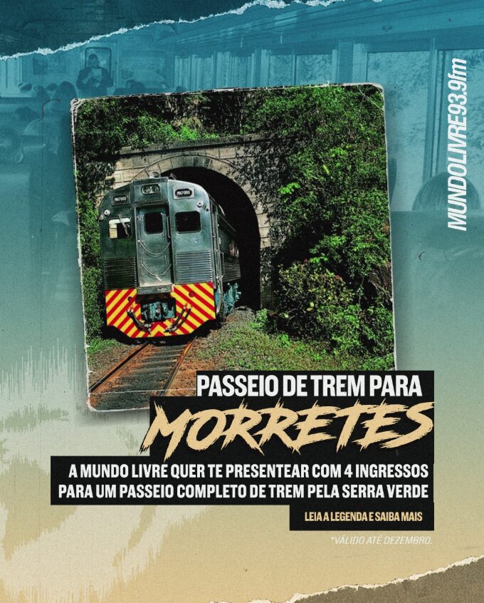 E a Sua Rádio de Atitude, vai levar vc +3 amigos para viver uma das experiências mais lindas do Paraná: o passeio de trem pela Serra do Mar, entre Curitiba e Morretes. Durante as 4 horas de trajeto, são 41 pontes, 13 túneis e um visual de tirar o fôlego, bem no coração da Mata Atlântica. Além da viagem, o presente inclui almoço típico em Morretes, visita aos pontos turísticos de Antonina e todo o translado de van. Você e mais 3 amigos em um dos passeio mais lindos do Paraná. Para embarcar nessa envie a #TREMNAMUNDO + seu nome completo para o nosso Whats (41) 99257-9390, mande quantas vezes quiser, quanto mais participar, mais chance de levar! Fique ligado na minha programação todos os dias pra saber quem vai curtir essa! (O translado de van atende até 7 km de raio da ferroviária e o passeio deve ser agendado previamente com a Serra Verde dentro do prazo do voucher.)