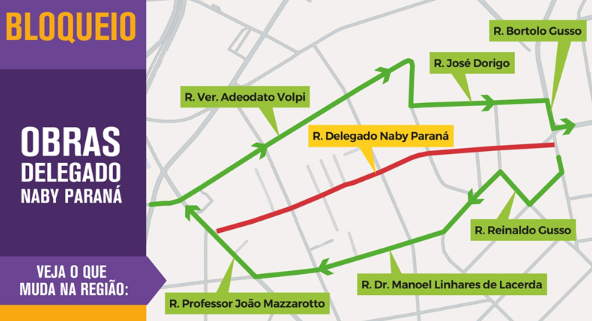 A partir de 9 de março, as intervenções na Delegado Naby Paraná vão avançar para o trecho entre as ruas Antônio Freitas Barbosa e Professor João Mazzarotto. As obras terão duração aproximada de um mês.